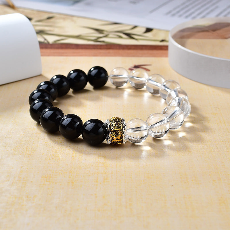 Natural White Crystal & Black Tourmaline Bead Bracelet – Six - Character Mantra Alloy Accent